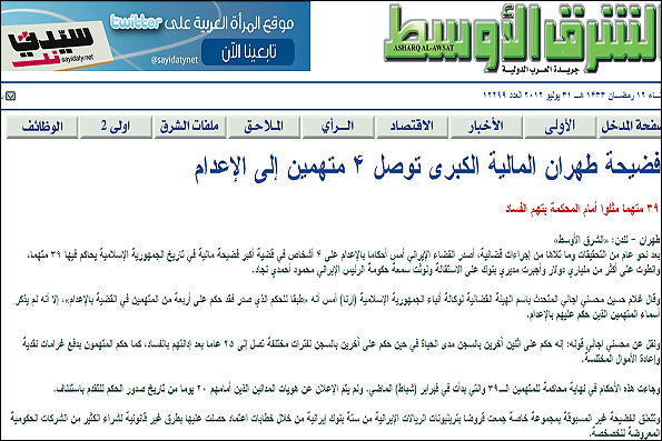الشرق الاوسط اعلام کرد: پس از گذشت یکسال، دستگاه قضایی ایران روز گذشته برای 4 نفر از متهمین بزرگترین پرونده فساد مالی در ایران حکم اعدام صادر کرد. این روزنامه عربی در این گزارش ادعا کرد: رسوایی مالی بیش از 2 میلیارد دلاری در ایران بسیاری از مدیران بانکی را مجبور به استعفا کرد و تاثیر منفی بر محبوبیت محممود احمدی نژاد رئیس جمهوری ایران بر جا گذاشت.