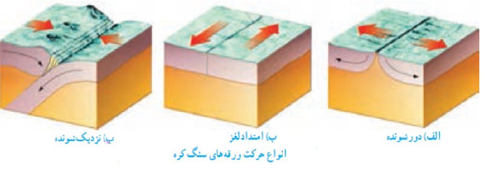 بسته به اینکه جهت چرخش در توده مذاب زیر پوسته زمین ( لایه جبه یا مانتل ) نسبت به توده مجاور دیگر چگونه باشد، انواع تنش های مختلف به پوسته زمین وارد می شود و در نهایت در اثر چنین حرکاتی در زیر قطعات پوسته زمین، اولا امکان دارد همان قطعات پوسته زمین گسیخته شوند، گسیختگی در صفحات پوسته زمین ممکنست از نوع کششی ( از هم دور شونده ) باشد که در آنصورت گسل های نرمال را در پوسته زمین ایجاد میکند و یا از نوع فشارشی که در آنصورت گسل های معکوس ایجاد خواهند شد. گسل های امتداد لغز هم وقتی پدیدار می شوند که حرکات توده های گرم زیر پوسته در دوجهت متضاد در راستای طرفین یک خط صورت بگیرد( شکل ۲). همچنین ممکن است در اثر جابجائی صفحات عظیم پوسته زمین، دو یا چند صفحه مثل صفحه عربستان و اوراسیا، صفحه هند و یا صفحه آمریکاری جنوبی ویا صفحه آفریقا، از هم دور یا به هم نزدیک شوند که در چنین جابجائی هایی رخداد آتشفشان و یا پدیده ی عظیم کوهزائی مشاهده خواهد شد. بعنوان مثال پیدایش کوه های زاگرس و البرز را در ایران ناشی از حرکت پوسته عربی به بسمت پوسته اواراسیا ( خاک سرزمین روسیه و کشورهای منفک شوروی سابق در سمت شرقی آن ) می باشد. همچنین است کوهزائی های آلپ – هیمالایا که قله های سربفلک کشیده این کمربند شرقی – غربی کره زمین زیبائی حیرت انگیزی را به کره زیبای زمین بخشیده است.