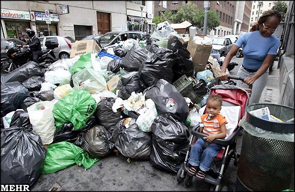 "بحران زباله". ناپل، ایتالیا. یک زن با بچه‌اش از کنار کوه زباله عبور می‌کند. ماموران شهرداری تمایلی به جمع‌آوری مداوم زباله‌ها ندارند. سالواتوره لاپورتا ـ اسوشیتدپرس