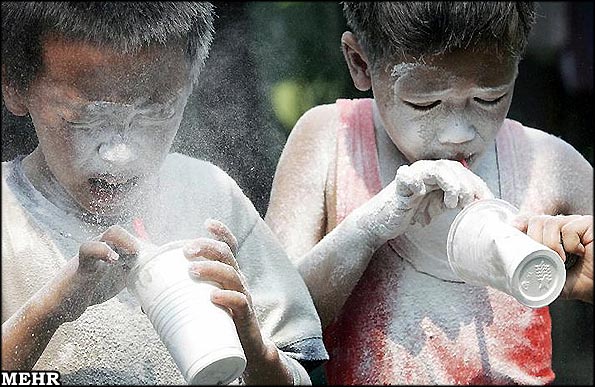 "بازی با آرد". مانیل، فیلیپین. چند پسربچه فیلیپینی در جشنواره‌ای درون لیوان‌های پلاستیکی محتوی آرد فوت می‌کنند.