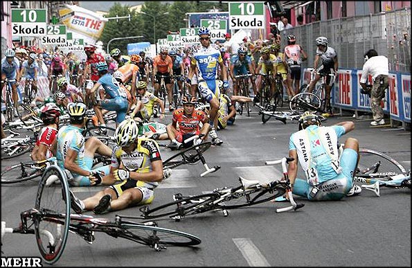 "مثل دومینو". ایتالیا. گروهی از دوچرخه‌سواران مسابقات دوچرخه‌سواری جیرو دیتالیا به هم برخورد کرده‌اند.