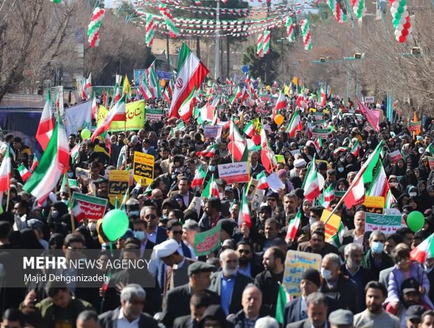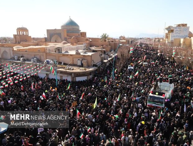 «۲۲ بهمن ماه، یوم الله، یوم الله»، «این همه لشکر آمده، به عشق رهبر آمده»، «مرگ بر آمریکا» و … همه از شعارهایی است که در جشن بزرگ انقلاب در یزد سر داده میشود.