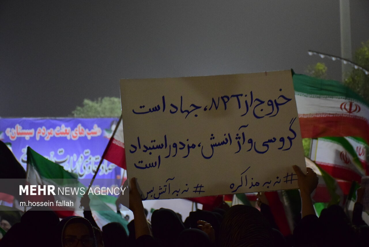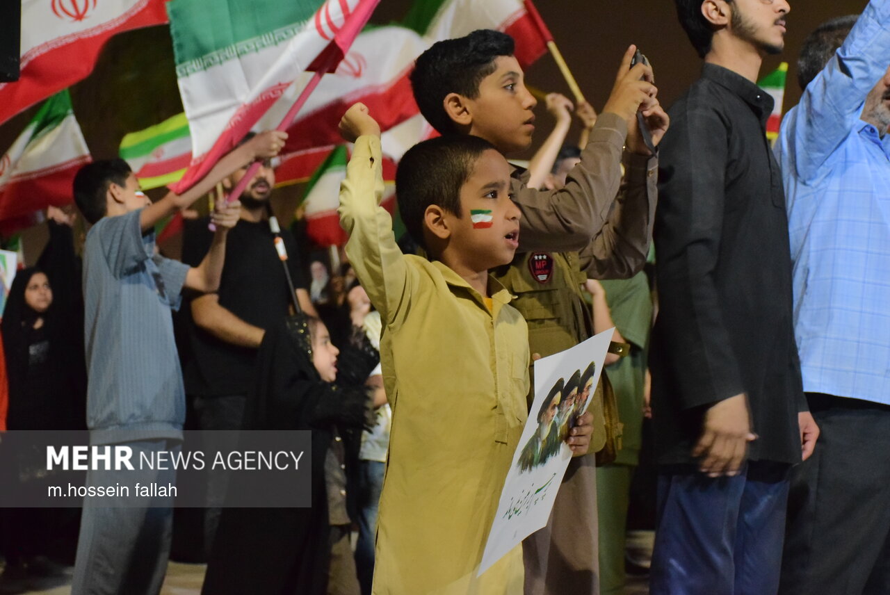 مردم ایرانشهر در حمایت از ایران و نیروهای مسلح کشور هر شب تجمع با شکوهی برگزار می کنند.