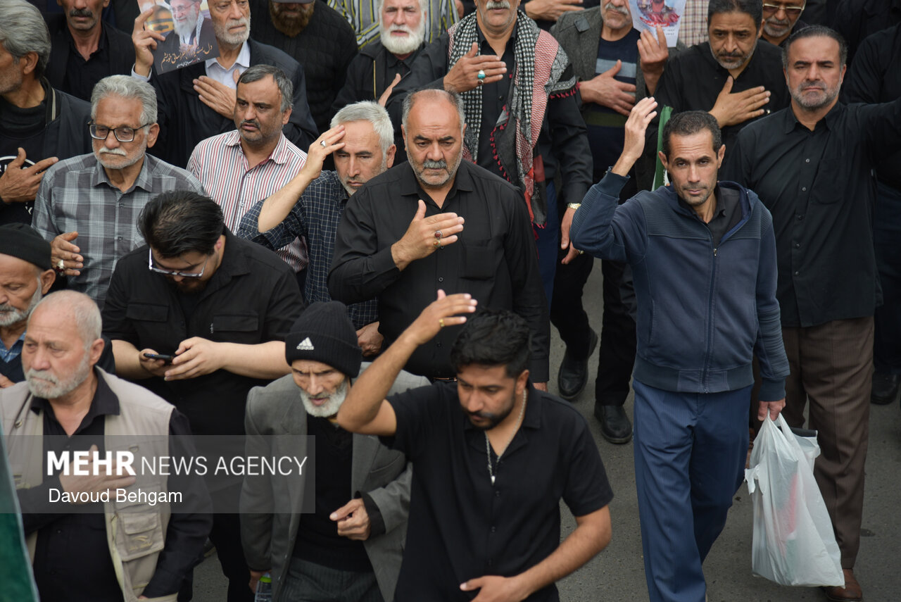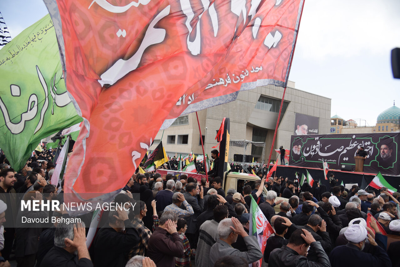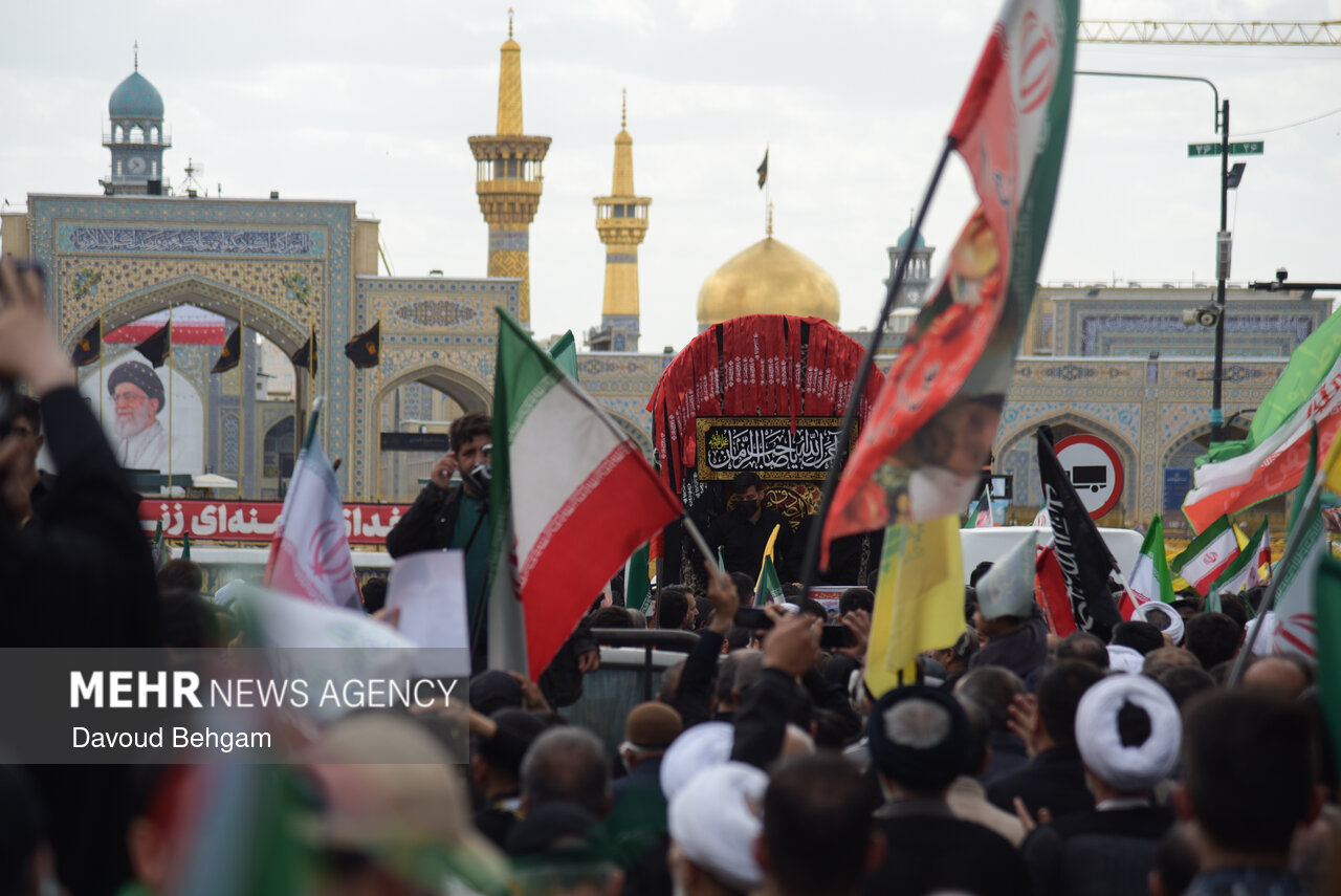 صبح امروز ۲۵ فروردین، اجتماع عزاداری صادقیون همراه با تشییع پیکر دو شهید مطهر جنگ تحمیلی امریکایی صهیونیستی، علی اکبر ساکت و یونس نظرزاده، از میدان شهدا تا حرم مطهر رضوی در میان سیل جمعیت عزاداران برگزار شد.